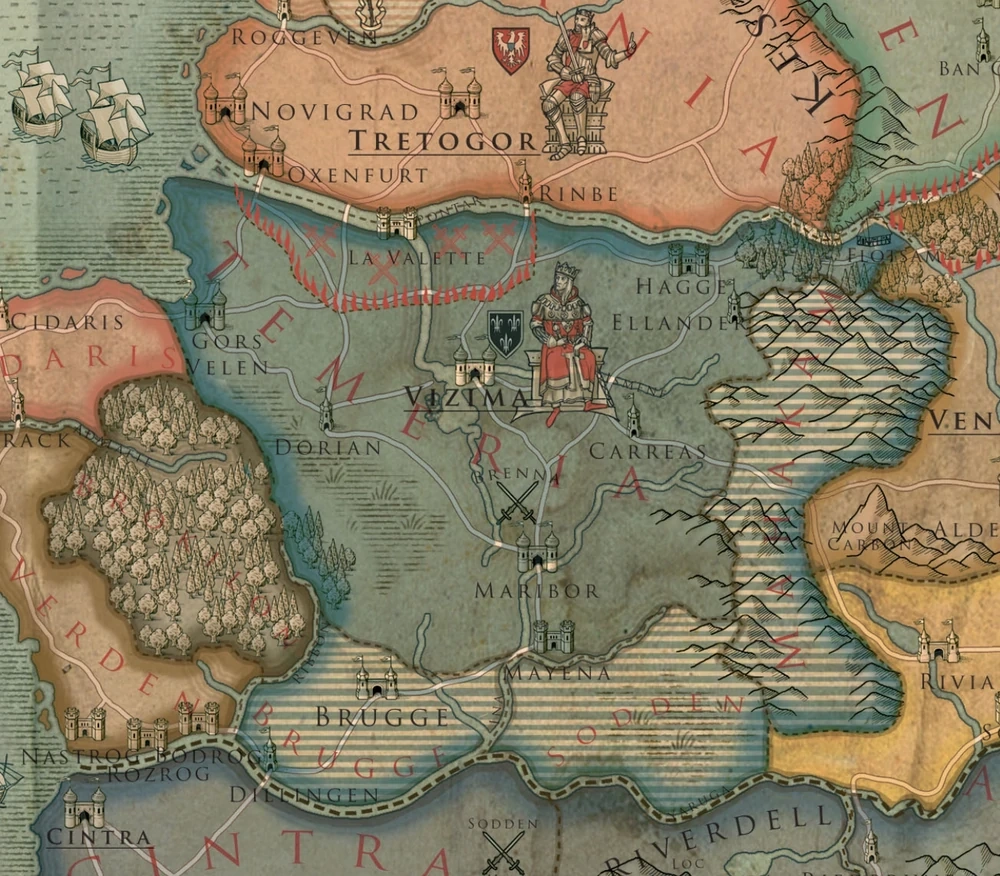 Temeria, Pontar nehrinin güneyinde uzanan kuzey krallıklarından biridir. Komşuları Redania, Kerack, Kaedwen, Aedirn, Mahakam, Lower Sodden ve Cidaris'tir. Birinci ve ikinci savaşlardan sonra Temeria, Nilfgaard'ın yenilgisinden en fazla kar elde ederek sınırlarını güneye Angren ve Riverdell'e kadar genişleterek Amell dağlarına ulaştı. Ancak Krallık, ekonomisi açısından da ağır bir darbe aldı ve bu da onu güney komşusundan mal almaya zorladı.